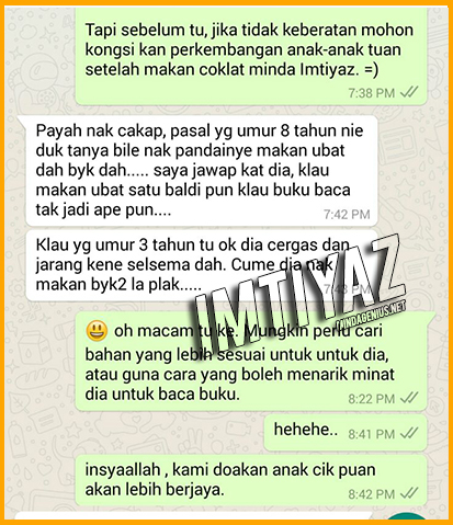 Coklat Minda Imtiyaz khas untuk ibu bapa yang mahukan anak-anak anda menjadi lebih fokus dan cemerlang dalam pelajaran. Gabungan formulasi 'superfood' yang sangat diingini oleh minda untuk berfungsi dengan baik. Coklat Minda Imtiyaz juga mambantu ketangkasan berfikir dan secara tidak langsung meningkatkan keupayaan fizikal dan emosi seseorang untuk memberikan yang terbaik dalam kehidupan!